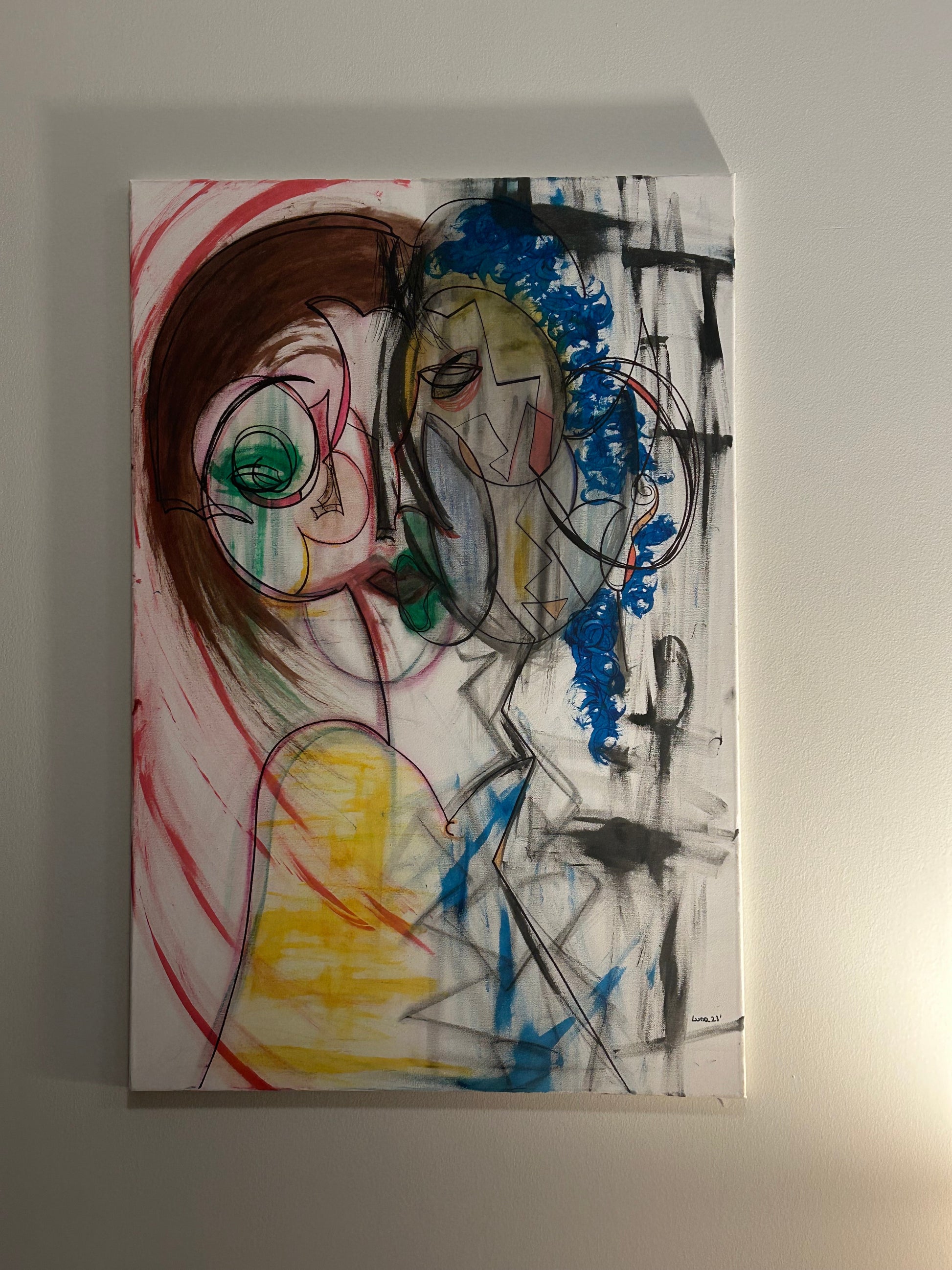 Some Of Us is one of the very unique pieces that represents a split figure. This piece mainly represents the state of shiftiness. To achieve separation, the left figure is rather colorful and vibrant and the right one is darker. Some Of Us was created with the use of markers, oil pastels, and acrylic paint.