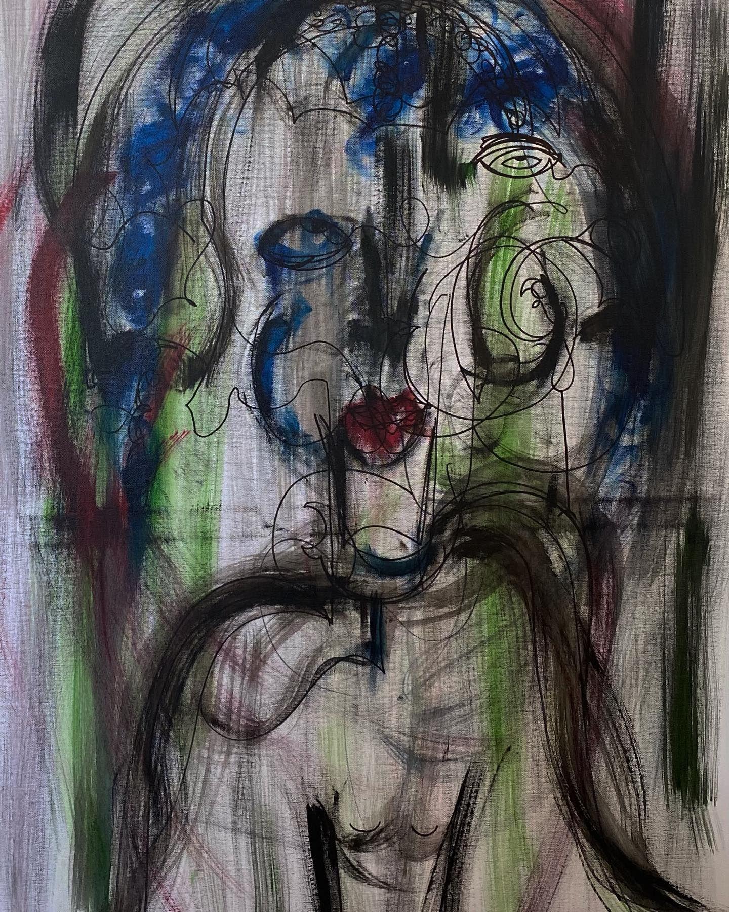 A dynamic abstract portrait blending vivid colors with fluid, chaotic lines, to form a captivating yet fragmented figure. The mix of deep blues, greens, and soft reds contrasts with the sketch-like figure, evoking themes of inner turmoil and beauty within imperfection.