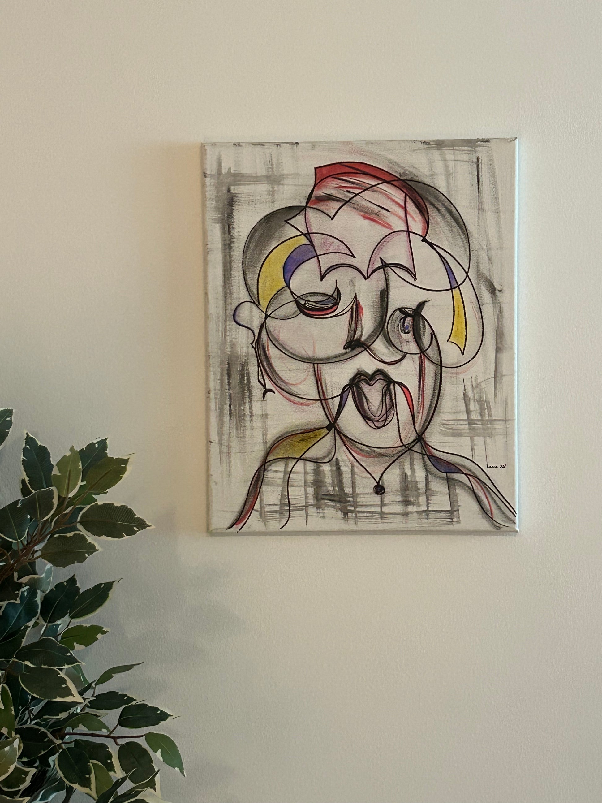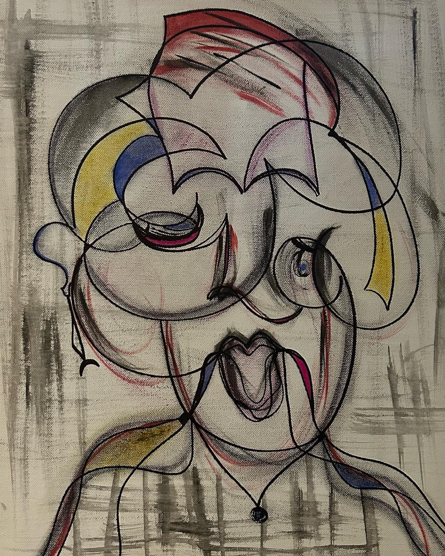 Bliss is a joyful piece that incorporates movement and fluidity, with lines that loop and curve in dynamic directions. The open mouth conveys a sense of expression, making it seem as if the figure is laughing. Although the piece is dominated by a dark color, the facial expression is what sparks the vibrancy and liveliness.