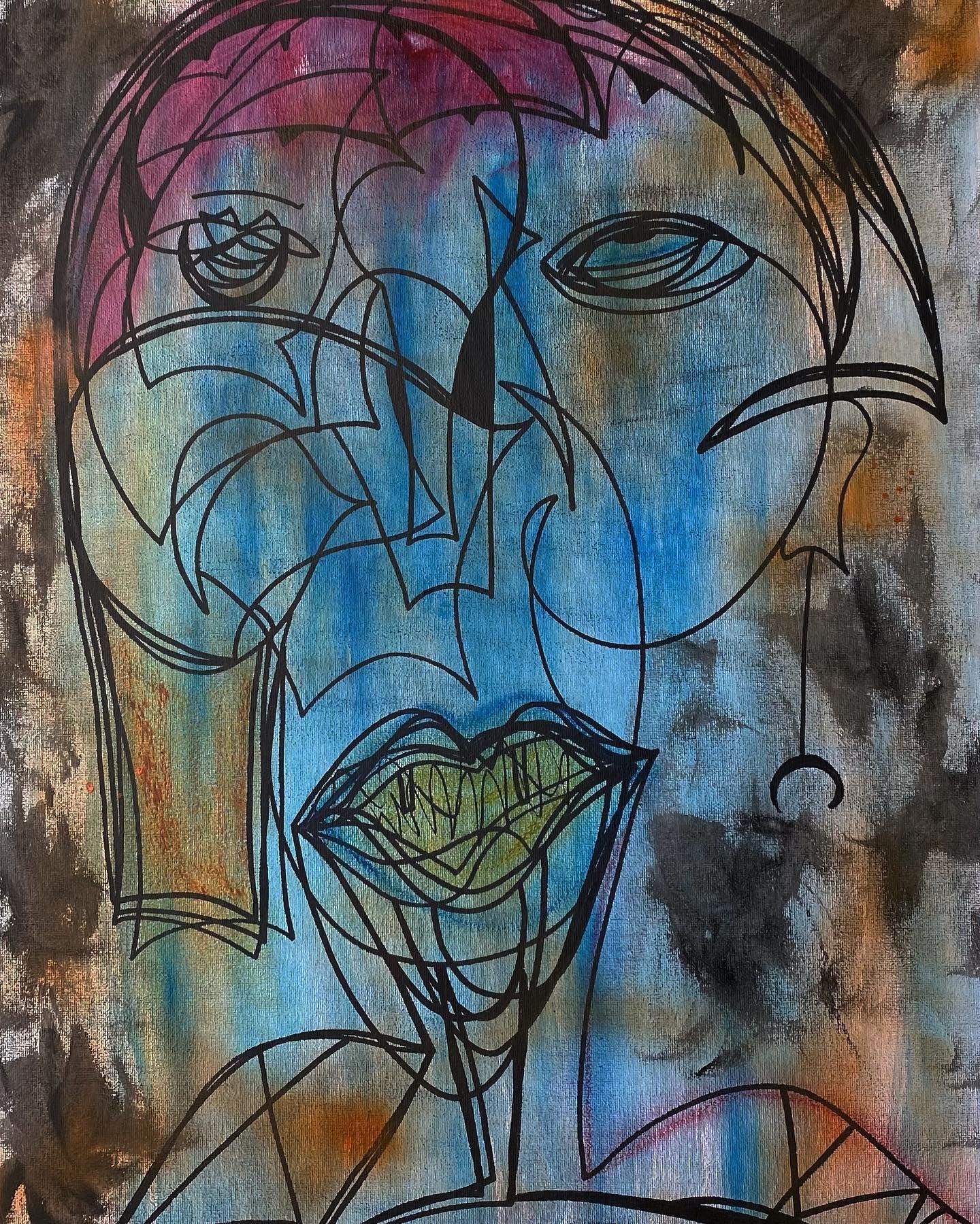 Blue Face is a distorted figure formed by thin, intersecting black outlines. It blends vibrant colors with bold and expressive lines, giving it a fragmented yet cohesive look. The piece evokes emotional depth, combining raw expression with a surreal quality.