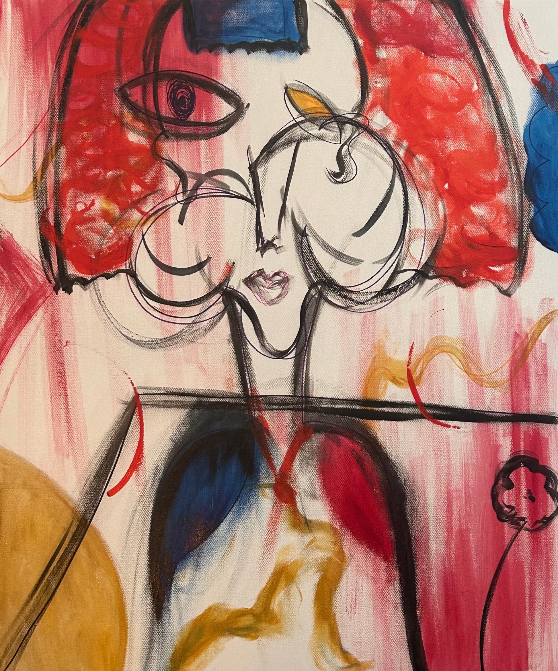 Bold Vibration is an abstract portrait that bursts with vibrant reds, deep blues, and soft yellow hues. Bold lines and expressive forms weave together to reveal a raw, unfiltered exploration of emotion and individuality.