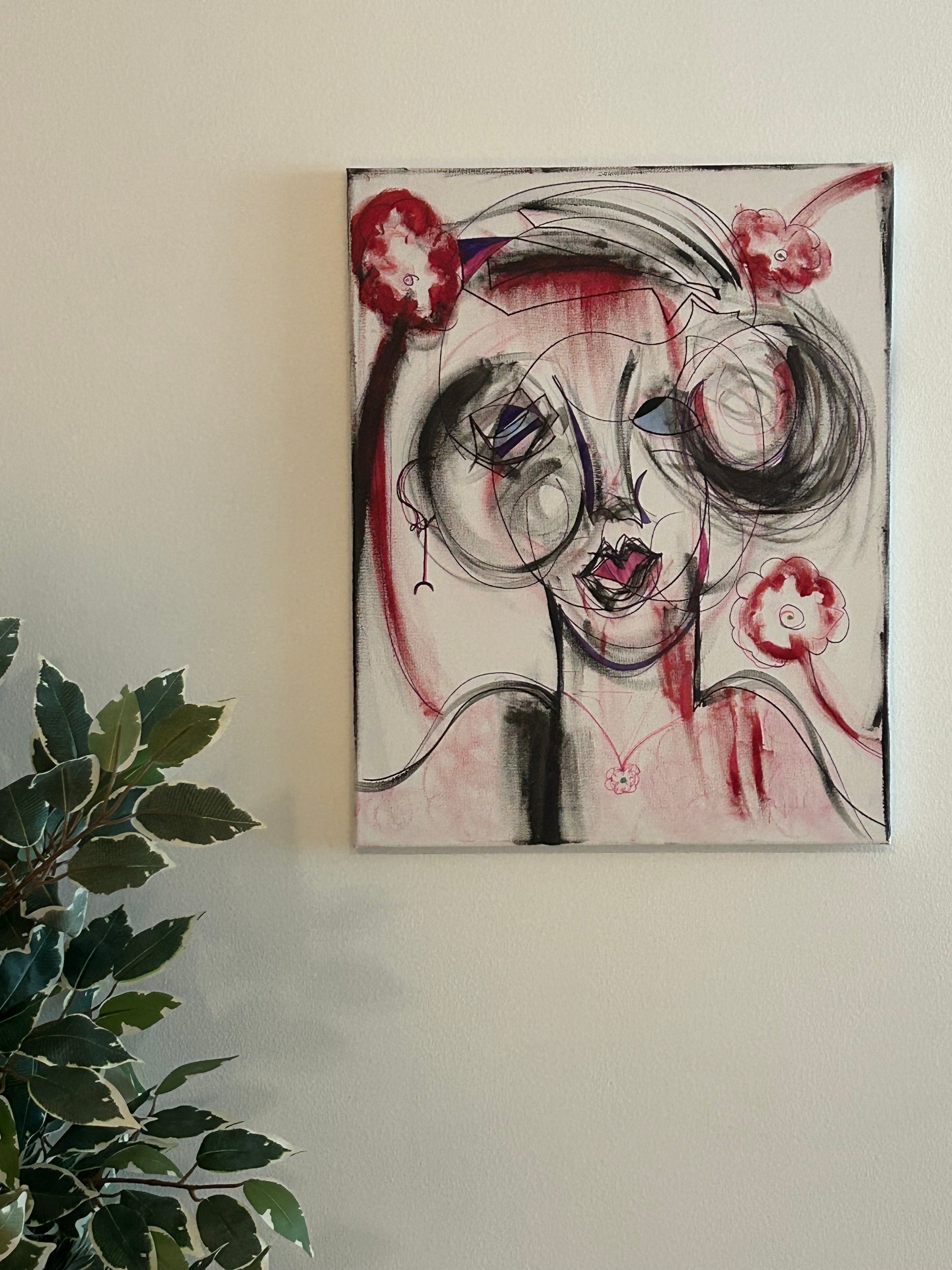 A vivid abstract portrait blending soft lines and bold strokes, featuring floral accents and expressive emotions. The distorted facial features and flowers convey a sense of introspection and dreamlike quality, inviting you to explore themes of identity, emotion, and transformation.