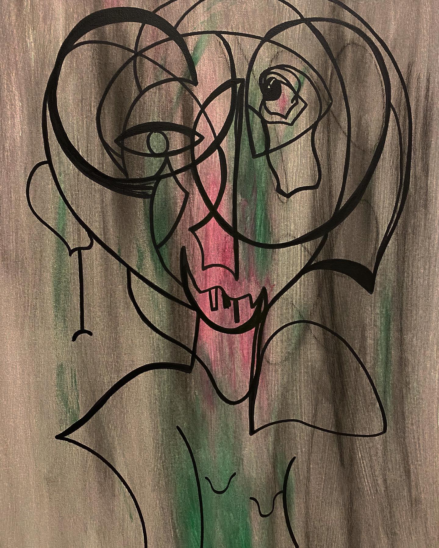 This piece is meant to represent a figure that is almost melting or slowly fading away. Melt was drawn with the use of black marker, splashed with green acrylic and pink Indian ink. The black is meant to emphasize on fear, and the pink and green are meant to slightly add balance and harmony.