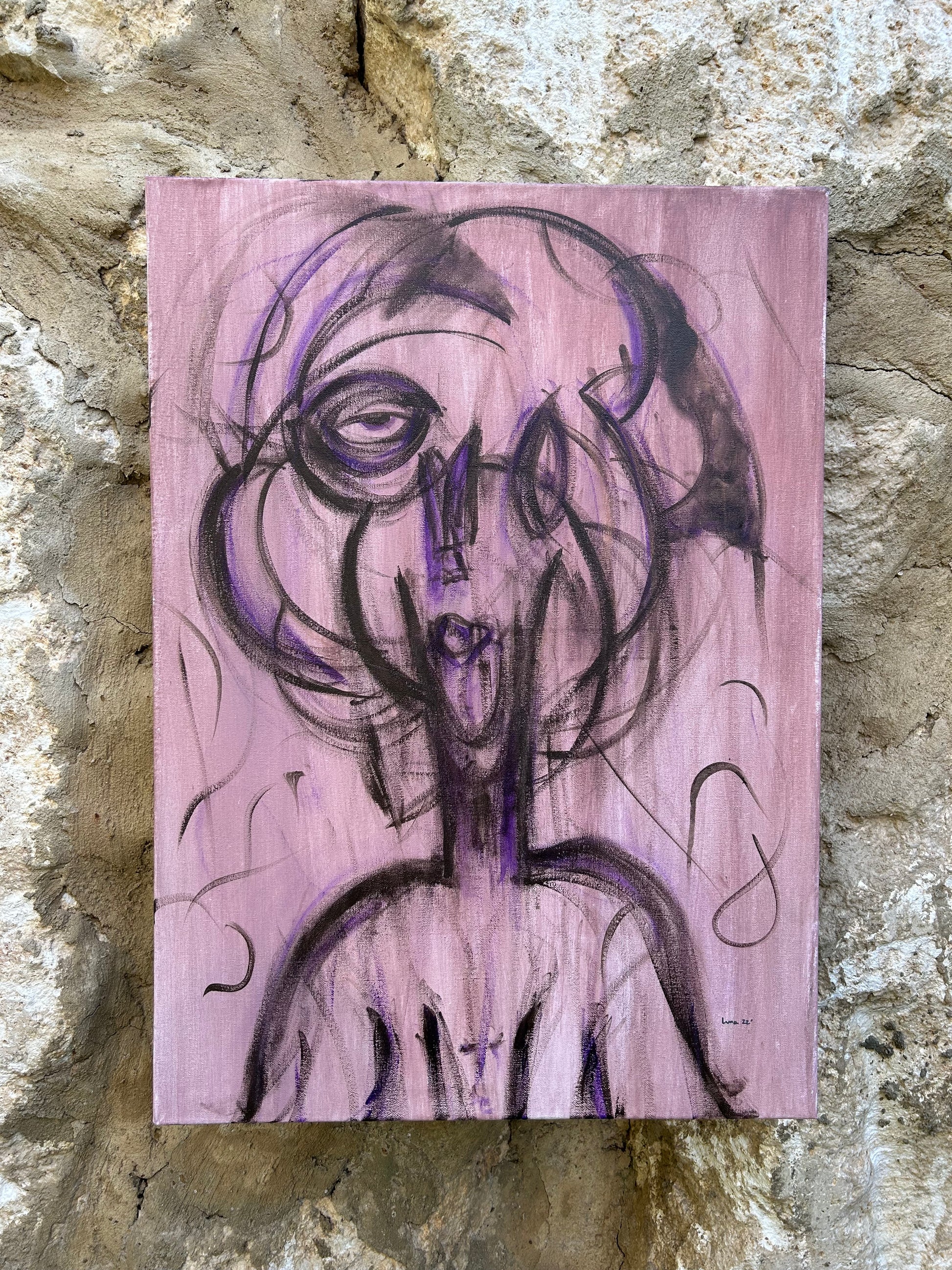 Tangled is a raw and expressive artwork that captures the essence of distortion and complexity. The piece features overlapping lines and fragmented facial features, creating a sense of entanglement and emotional depth. With dark, fluid strokes against a muted purple background, it evokes themes of introspection, chaos, and the layered nature of human emotion.