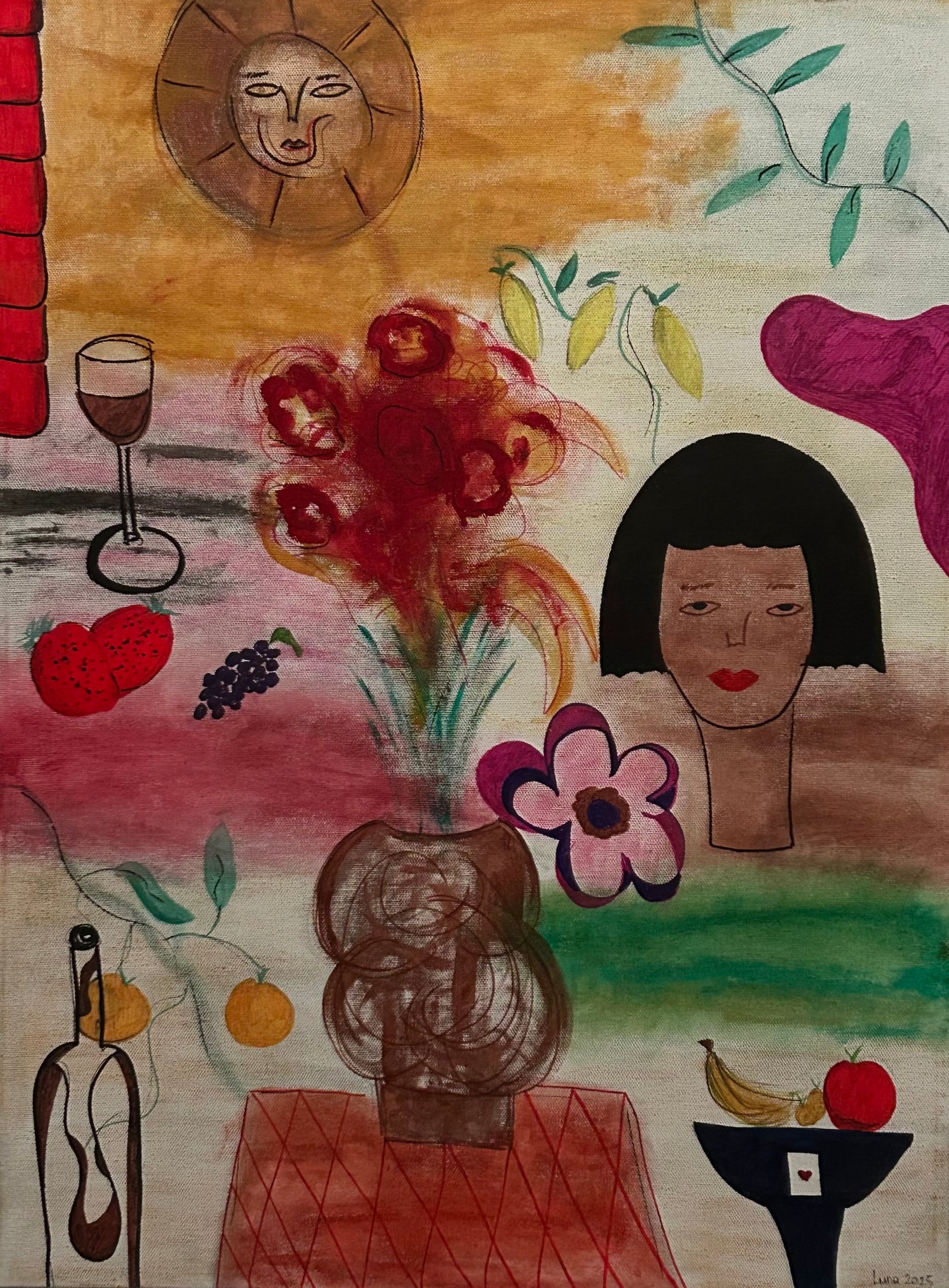 A dreamy still life blending surrealism and symbolism, “Silent Sun” captures a moment where objects, faces, and nature intertwine. The warm, earthy tones and floating elements create a dreamlike atmosphere, evoking mystery, nostalgia, and quiet contemplation.