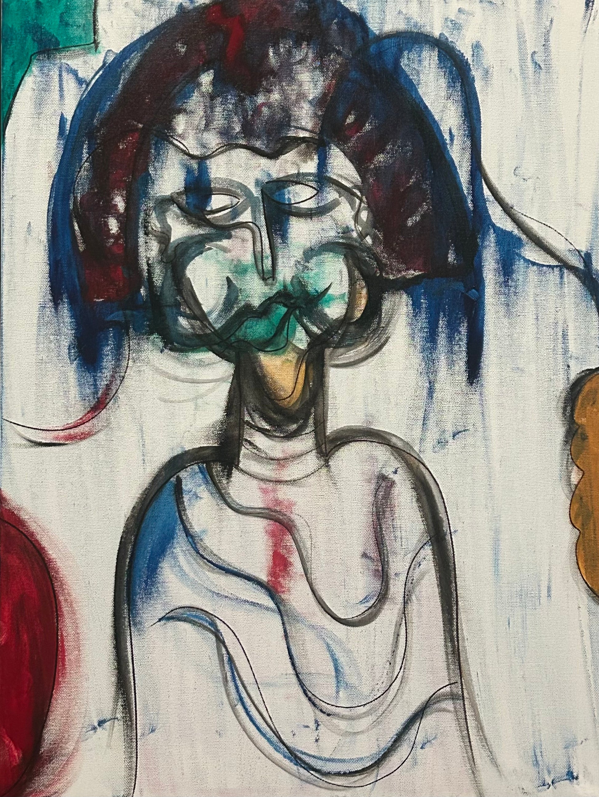 A bold and expressive portrait of a distorted figure, blending colors and textures in a dynamic interplay. Unseen evokes a subtle dialogue between the conscious and subconscious, using fluid lines and fragmented features to explore themes of identity, memory, and transformation.